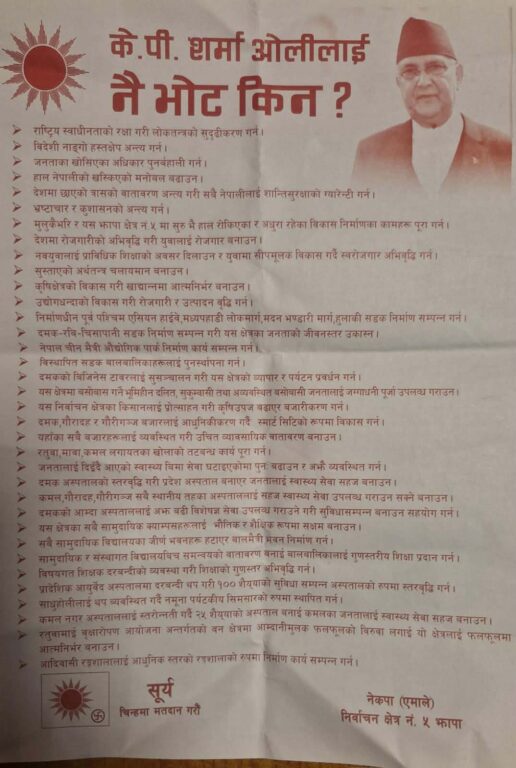 ‘केपी शर्मा ओलीलाई नै भोट किन?’ शीर्षकको अपिलमा देशमा देखिएको त्रासको वातावरण अन्त्य गर्दै नागरिकको मनोबल उच्च बनाउन ओलीलाई विजयी गराउनुपर्ने उल्लेख छ। झापा ५ मा सुरु भएका विकास योजनाहरू सम्पन्न गर्न, सुस्ताएको अर्थतन्त्र चलायमान बनाउन र कृषि क्षेत्रमा आत्मनिर्भरता हासिल गर्न पनि ओलीको नेतृत्व आवश्यक रहेको दाबी गरिएको छ।