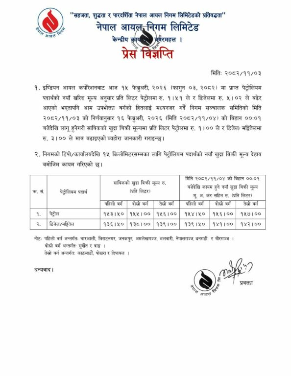 निगमका अनुसार, पेट्रोल लिटरमा एक रुपैयाँ बढाइएको छ । त्यस्तै, डिजेल/मट्टीतेलको मूल्य लिटरमा तीन रुपैयाँ बढाइएको निगमले जनाएको छ ।