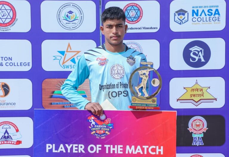 टस हारेर ब्याटिङको निम्तो पाएको काठमाडौंले निर्धारित २० ओभरमा ५ विकेट गुमाउदै १ सय ४२ रनको योगफल बनायो । ‘प्लेयर अफ द म्याच’ तपेन्द्र विष्टले नटआउट ४९, सन्दिप साउदले २३ र जोन ओलीले १९ रन जोडे । बलिङमा कोशीका प्रज्ज्वल सेढाईंले २ तथा आकाश यादव र उज्ज्वल खतिवडाले १–१ विकेट हात पारे ।