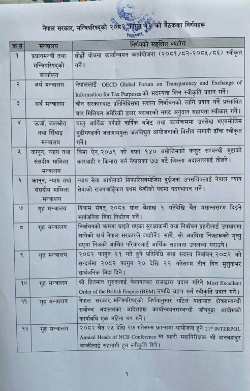 गृहमन्त्री एवं नेपाल सरकारका प्रवक्ता ओमप्रकाश अर्यालले आज आयोजित पत्रकार सम्मेलनमा मन्त्रिपरिषद्को पछिल्लो बैठकका निर्णयहरू सार्वजनिक गर्दै फागुन २० देखि २२ गतेसम्म सार्वजनिक बिदा दिने निर्णय भएको बताए ।