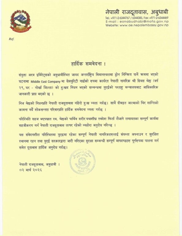 संयुक्त अरब इमिरेट्समा इरानको आक्रमणका क्रममा ज्यान गुमाउने नेपाली नागरिकको पहिचान खुलेको छ। नेपाली राजदूतावास, अबुधाबीले दिएको जानकारी अनुसार मृतक गोरखा जिल्लाका २९ वर्षीय दिवस श्रेष्ठ रहेका छन्।