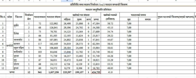 कर्णाली प्रदेशका १२ जिल्लामा प्रतिनिधि सभा सदस्य निर्वाचन अन्तर्गत आज दिउँसो २ बजेसम्म करिब ४१ प्रतिशत मतदान भएको छ। प्रदेशभर कुल १० लाख ३७ हजार २५० मतदातामध्ये ४ लाख २४ हजार ७५५ जनाले मतदान गरेका छन्।