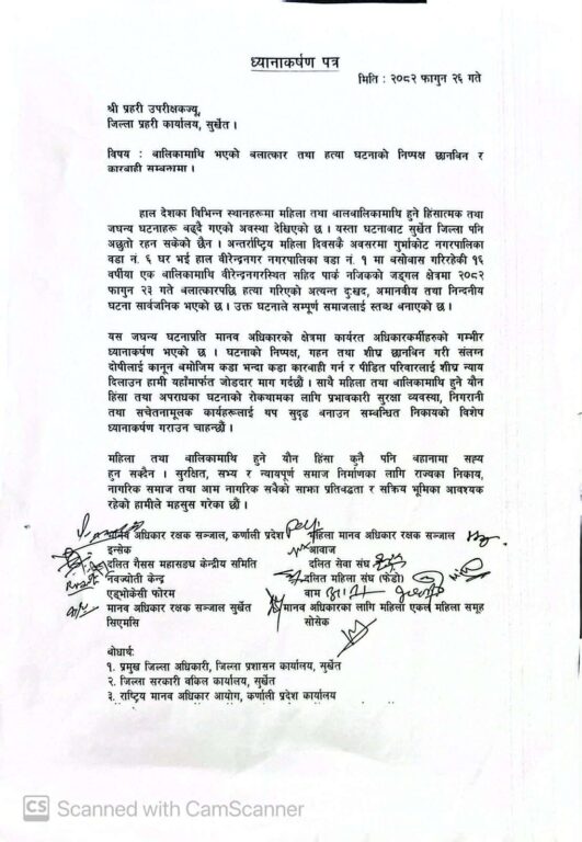 त्यसैगरी महिला तथा बालिकामाथि हुने यौन हिंसा तथा अपराधका घटनाको रोकथामका लागि प्रभावकारी सुरक्षा व्यवस्था, निगरानी र सचेतनामूलक कार्यक्रमहरूलाई थप सुदृढ बनाउन सम्बन्धित निकायको ध्यानाकर्षण गराइएको छ । उक्त ज्ञापनपत्रको बोधार्थ प्रमुख जिल्ला अधिकारी, जिल्ला प्रशासन कार्यालय सुर्खेत, जिल्ला सरकारी वकिल कार्यालय सुर्खेत तथा राष्ट्रिय मानव अधिकार आयोग कर्णाली प्रदेश कार्यालयलाई पनि पठाइएको जनाइएको छ ।