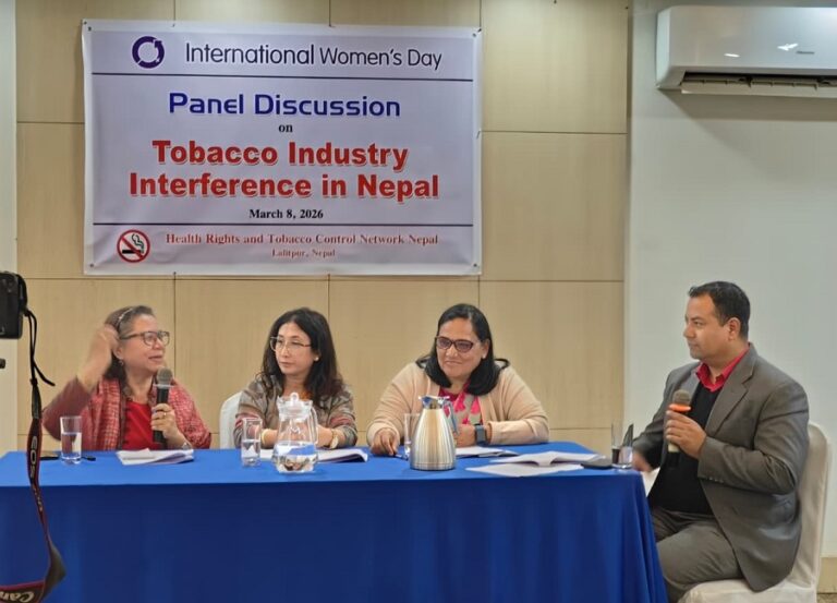 स्वास्थ्य अधिकार तथा सुर्ती नियन्त्रण सञ्जाल नेपालले अन्तराष्ट्रिय महिला दिवसको सन्दर्भमा आइतवार आयोजना गरेको सुर्ती नियन्त्रणमा उद्योगीको हस्तक्षेप र महिलाको भूमिका विषयक अन्तरसंवाद तथा प्यानल डिस्कसन कार्यक्रममा सामाजिक क्षेत्रका महिला नेतृहरु सुर्ती नियन्त्रणमा एकजुट हुनुपर्ने आवश्यकता बोध गरेका हुन् ।