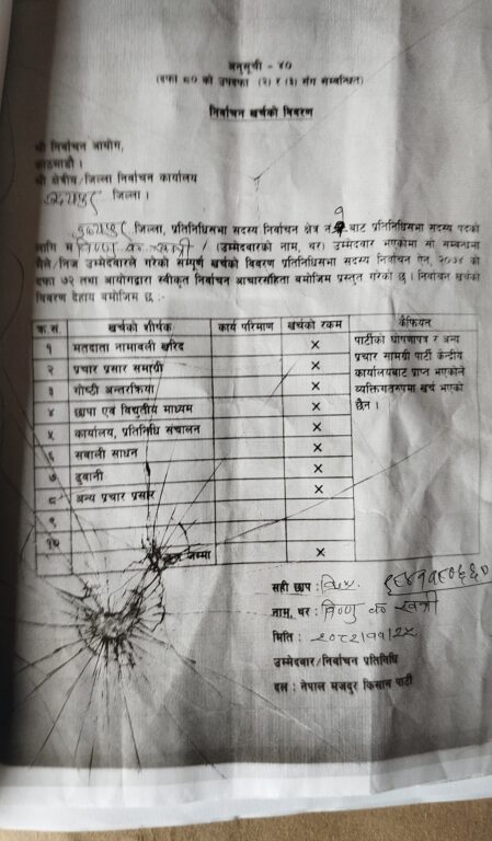 अन्य उम्मेदवारहरुले आफूले निर्वाचनमा प्रचारप्रसार, यातायात, खाजा खाना, कार्यालय व्यवस्थापन, तथा कार्यकर्ता परिचालन लगायतका शिर्षकमा उल्लेख्य खर्च गरिरहदा नेमकिपाका खत्रीले भने फाँटबारी फारममा शून्य खर्च देखाएर फाँटबाी पेस गरेको जिल्ला निर्वाचन कार्यालयका सूचना अधिकारी डिगम बहादुर कार्कीले बताए ।