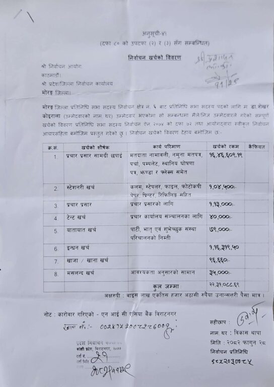 नेपाली काङ्ग्रेस नेता शेखर कोइरालाले मोरङ–६ बाट प्रतिनिधि सभा सदस्य निर्वाचनका लागि भएको आफ्नो चुनावी खर्च विवरण बुझाएका छन्।