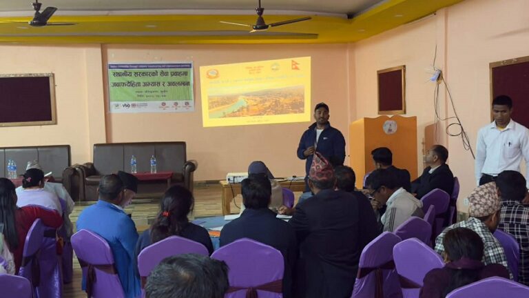 स्थानीय सरकारको सेवा प्रवाहलाई थप प्रभावकारी, पारदर्शी र जबाफदेही बनाउने उद्देश्यका साथ सुर्खेतको वीरेन्द्रनगरमा एक समीक्षा कार्यक्रम सम्पन्न भएको छ । बुधवार वीरेन्द्रनगरमा सम्पन्न ‘स्थानीय सरकारको सेवा प्रवाहमा जबाफदेहिता, अभ्यास र अवलम्बन’ विषयक उक्त समीक्षा कार्यक्रममा भेरीगंगा नगरपालिकाका नगर प्रमुख यज्ञ प्रसाद ढकालको प्रमुख आतिथ्यतामा सम्पन्न सो कार्यक्रममा भेरीगंगाकी उपप्रमुख धनसरा बोहरा, लेकबेशी नगरपालिकाकी उपप्रमुख विमला खडलुक र वीरेन्द्रनगर नगरपालिकाका उपप्रमुख निलकण्ठ खनालको विशेष आतिथ्यता रहेको थियो । कार्यक्रममा वीरेन्द्रनगर, भेरीगंगा र लेकबेशी नगरपालिकाका जनप्रतिनिधिहरूका साथै विभिन्न शाखाका प्रमुखहरूको सहभागिता रहेको थियो ।