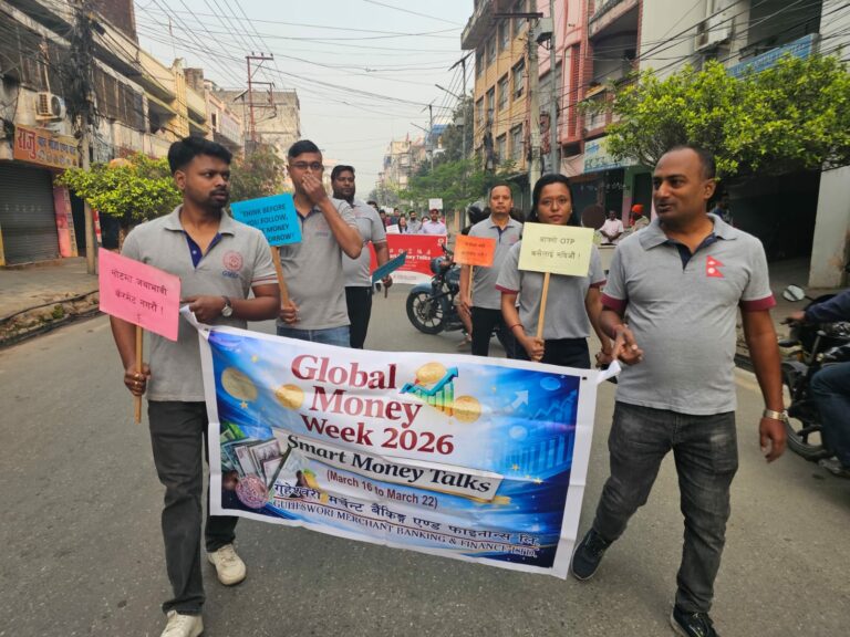 गुहेश्वरी मर्चेन्ट बैंकिङ्ग एण्ड फाइनान्स लिमिटेडले ग्लोबल मनी विक २०२६ (स्मार्ट मनी ट्याक्स) को अवसरमा नेपालका विभिन्न प्रदेशहरूमा ¥याली आयोजना गर्नुका साथै विद्यार्थी, साना तथा मझौला व्यापारी र आमा समूहहरूका लागि वित्तीय साक्षरता सम्बन्धी कार्यक्रम सफलतापूर्वक सञ्चालन गर्दै आएको छ ।