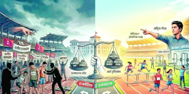 नयाँ सरकारले खेलकुदमा केवल मन्त्री र सदस्यसचिवमात्र फेर्ने होइन, बरु दशकौँदेखि जकडिएको परम्परागत र संकुचित सोचको अन्त्य गर्नुपर्ने चुनौती छ । यदि, अब पनि खेलकुदलाई राजनीतिक कार्यकर्ता व्यवस्थापन गर्ने थलोका रूपमा मात्र हेरियो भने नेपाली खेलकुदको भविष्य माटोमा नै दबिएर रहने निश्चित छ । नेपाली खेलकुद इतिहासलाई नियाल्दा लोकतन्त्रको आगमनपछि विकासले गति लिने अपेक्षा थियो ।