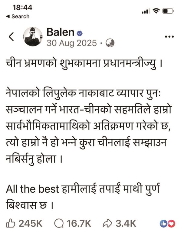तर, पछिल्ला सात महिनामा स्थितिले एकाएक कोल्टे फेरेको छ । जेन–जी आन्दोलनपछिको राजनीतिक उथलपुथल र त्यसपछिको २१ फागुनको निर्वाचनले एकाएक लिपुलेक हाम्रो हो, हाम्रो सार्वभौमिकता माथिको अतिक्रमण रोक भन्ने दायित्व तिनै बालेनको काँधमा आएको छ । बालेन अबको ५ दिनमा नेपालको प्रधानमन्त्रीमा नियुक्त हुनुहुनेछ । तर, बालेन प्रधानमन्त्रीमा नियुक्त हुने सम्मुखमा नै उता भारतले लिपुलेक हुँदै चीनसँग व्यापार खुलाउने घोषणा गरेको हो ।