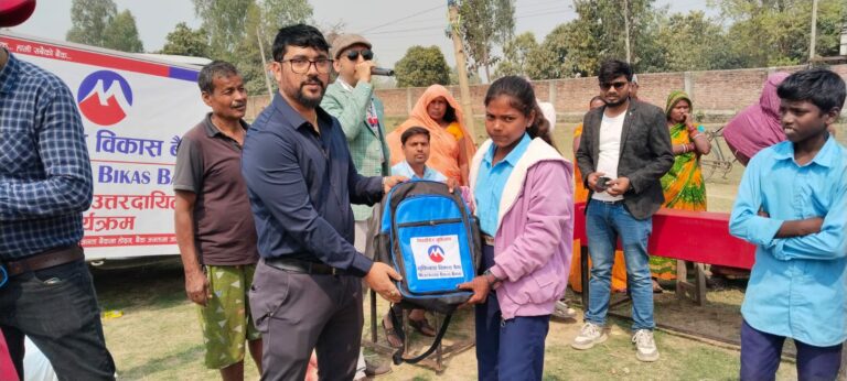 मुक्तिनाथ विकास बैंकले “अवसरको झोला” अभियान सञ्चालन गर्दै आर्थिक रूपमा कमजोर तथा अवसरबाट वञ्चित विद्यार्थीलाई विद्यालय झोला र स्टेसनरी (स्टेशनरी) सामग्री वितरण गरेको छ ।