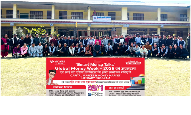 एन आई सी एशिया क्यापिटल लिमिटेडले ग्लोबल मनी विक–२०२६ को अवसरमा सिन्धुपाल्चोकस्थित मेलम्ची भ्याली क्याम्पसमा मुद्रा बजार तथा पुँजी बजार साक्षरतासम्बन्धी कार्यक्रम सम्पन्न गरेको छ ।