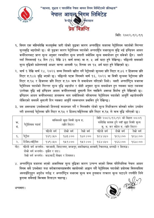 निगमले मध्यपूर्वमा जारी युद्धका कारण अन्तर्राष्ट्रिय बजारमा पेट्रोलियम पदार्थको निरन्तर मूल्यवृद्धि भइरहेको जनाएको छ ।