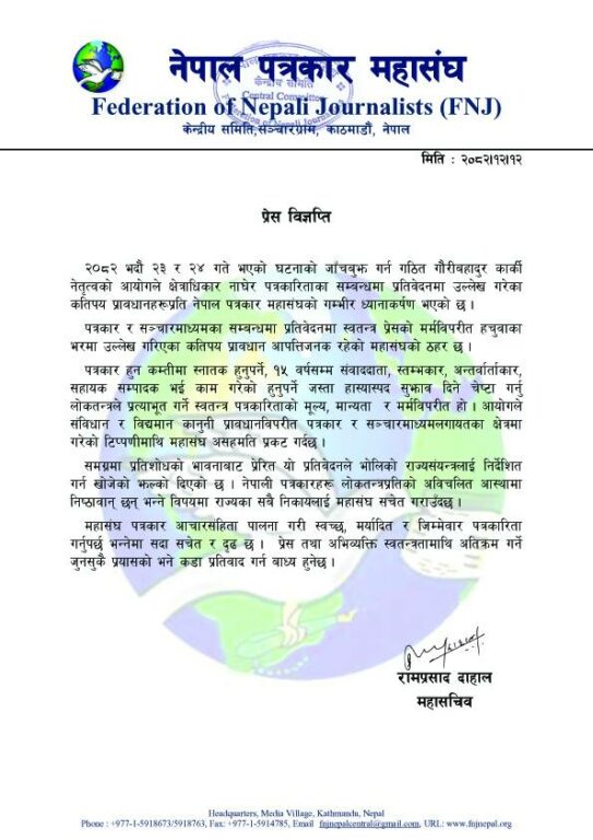गौरीबहादुर कार्की नेतृत्वको आयोगले २०८२ भदौ २३ र २४ गतेका घटनाबारे तयार पारेको प्रतिवेदनमा पत्रकारिता सम्बन्धी क्षेत्राधिकार नाघेका प्रावधान समेटिएको भन्दै नेपाल पत्रकार महासंघले गम्भीर आपत्ति जनाएको छ। महासंघले प्रतिवेदनमा स्वतन्त्र प्रेसको मर्मविपरीत हचुवाका आधारमा राखिएका सुझाव आपत्तिजनक रहेको ठहर गरेको छ।