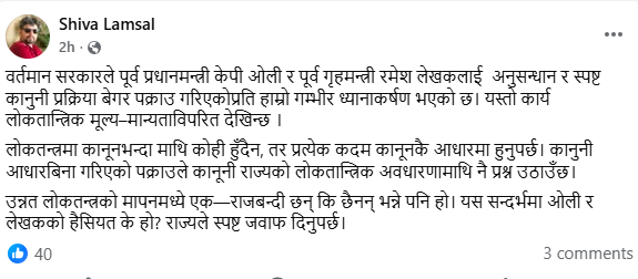 काठमाडौँमा नेपाल प्रेस युनियनका अध्यक्ष शिव लम्सालले पूर्व प्रधानमन्त्री केपी शर्मा ओली र पूर्व गृहमन्त्री रमेश लेखकलाई स्पष्ट कानुनी प्रक्रिया बिना पक्राउ गरिएको भन्दै आपत्ति जनाएका छन्। उनले यस्तो कदम लोकतान्त्रिक मूल्य र कानुनी राज्यको अवधारणाविपरीत भएको बताएका छन्।