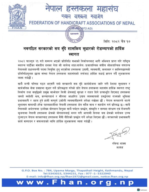 हस्तकला उद्यमी, व्यवसायी, कलाकार तथा कालिगढहरूको प्रतिनिधिमूलक छाता संस्थाको रूपमा महासंघले मन्त्री परिषद् गठनसँगै नयाँ सरकारले सार्वजनिक गरेको सय बुँदे कार्ययोजनालाई स्वागत गर्दै देशमा सुशासन र सार्वजनिक सेवा प्रवाहमा सुधार हुने अपेक्षा गरेको जनाएको छ ।