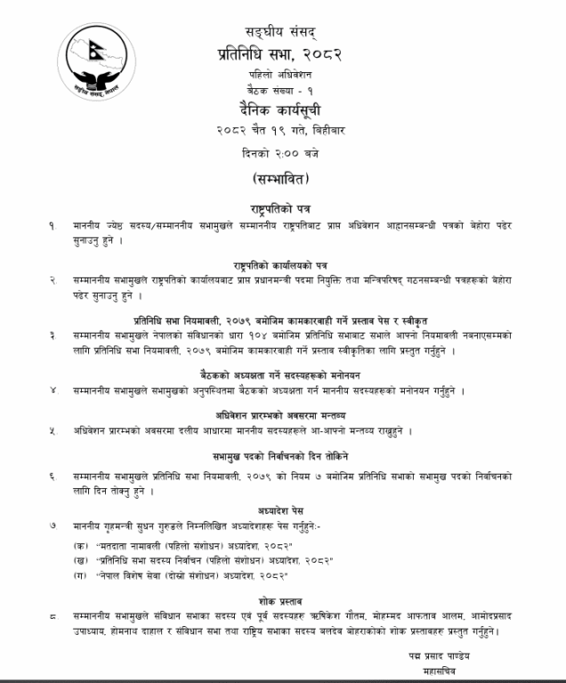संसद् सचिवालयका अनुसार बैठक सञ्चालनका लागि आवश्यक सबै तयारी पूरा भइसकेको छ। पहिलो बैठकमा राष्ट्रपतिबाट प्राप्त अधिवेशन आह्वानसम्बन्धी पत्र वाचन गरिनेछ भने प्रधानमन्त्री नियुक्ति र मन्त्रिपरिषद् गठनबारे जानकारी पनि प्रस्तुत गरिनेछ। साथै, बैठकमा विभिन्न महत्त्वपूर्ण एजेन्डामाथि छलफल हुने जनाइएको छ।