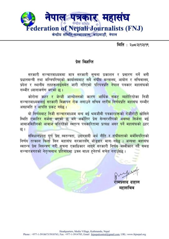 प्रधानमन्त्री तथा मन्त्रिपरिषद्को कार्यालयले सरकारी सूचना केवल सरकारी सञ्चारमाध्यममार्फत मात्र प्रकाशन तथा प्रसारण गर्न निर्देशन दिएपछि नेपाल पत्रकार महासंघले गम्भीर आपत्ति जनाएको छ।