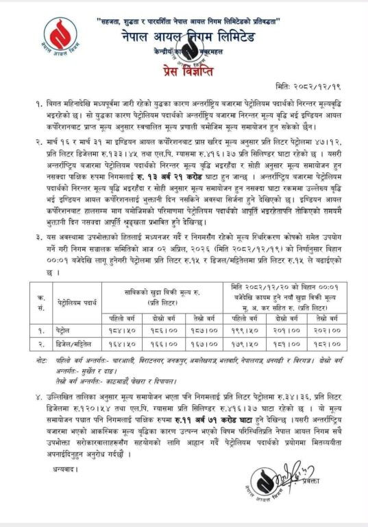 नयाँ मूल्यसूची बुधबार राति १२ बजेपछि लागू हुनेछ। निगमले मध्यपूर्वमा जारी युद्धका कारण अस्वाभाविक मूल्य बढाउनु परेको बताएको छ।