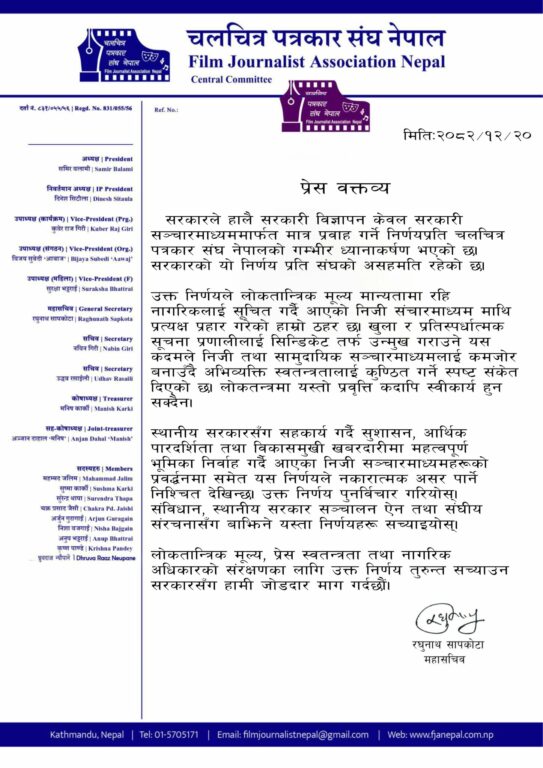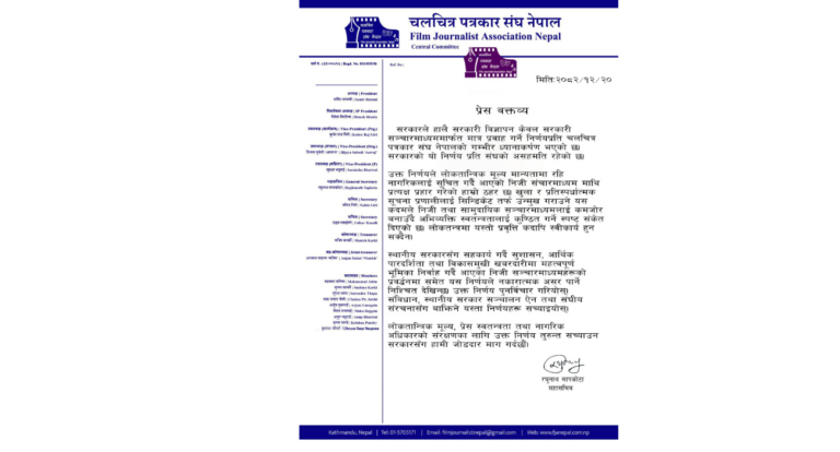 चलचित्र पत्रकार संघ नेपालले सरकारले हालै सरकारी विज्ञापन केवल सरकारी सञ्चारमाध्यममार्फत मात्र प्रवाह गर्ने निर्णयप्रति गम्भीर आपत्ति जनाएको छ। संघले उक्त निर्णयले निजी तथा सामुदायिक सञ्चारमाध्यममाथि प्रत्यक्ष असर पार्ने र अभिव्यक्ति स्वतन्त्रता कमजोर बनाउने ठहर गरेको छ।