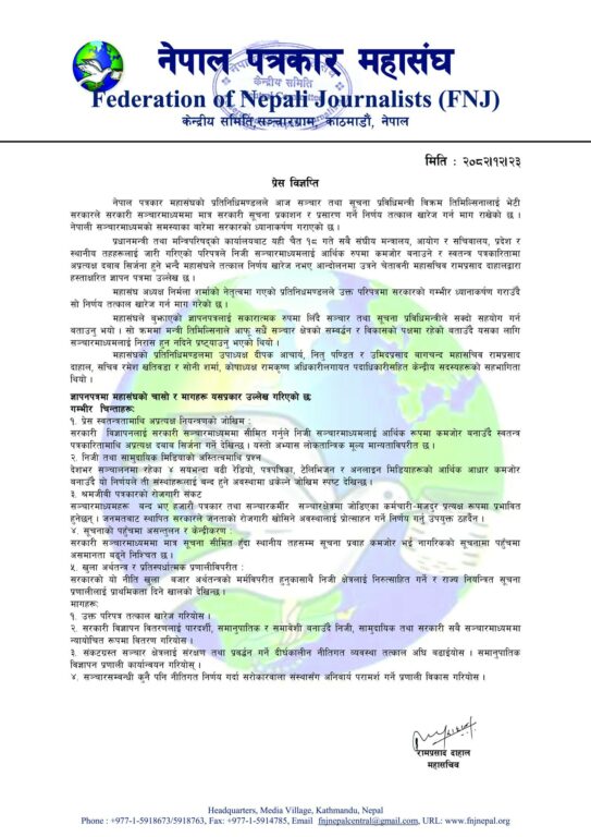 नेपाल पत्रकार महासंघ को प्रतिनिधिमण्डलले सञ्चार तथा सूचना प्रविधिमन्त्री विक्रम तिमिल्सिना लाई भेटी सरकारी सञ्चारमाध्यममा मात्र सरकारी सूचना प्रकाशन–प्रसारण गर्ने निर्णय तत्काल खारेज गर्न माग गरेको छ। महासंघले उक्त निर्णयले निजी तथा सामुदायिक सञ्चारमाध्यमलाई आर्थिक रूपमा कमजोर बनाउने र प्रेस स्वतन्त्रतामाथि अप्रत्यक्ष दबाब सिर्जना गर्ने जनाएको छ।