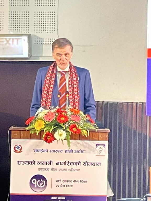त्यसैगरी नेपालका लागी जर्मनी राजदूत उडोएल्जीनफलले स्वास्थ्य बीमा नेपालका लागी महत्वूर्ण रहेको जानकारी गराउनुभयो । त्यसैगरी बीमाबोर्डका कार्यकारी निर्देशक डां कृष्ण प्रसाद पौडलले यहा बार्षिकोत्सव मनाईरहदा बिभिन्न अस्पतालमा सेवा अवरूद्द भएका गुनासा र चुनौतीको सूचना आईरहेका छौ । जति समस्या र चुनौती छन समाधान गर्न नसकिने छैनन् भन्नुभयो । सोही अवसरमा स्वस्थ्य सेवा बिभागका महानिर्देशक डा. केशर बहादुर ढकालले सबै मिलेर समस्याको समाधान गर्न आग्रह गर्नुभयो ।