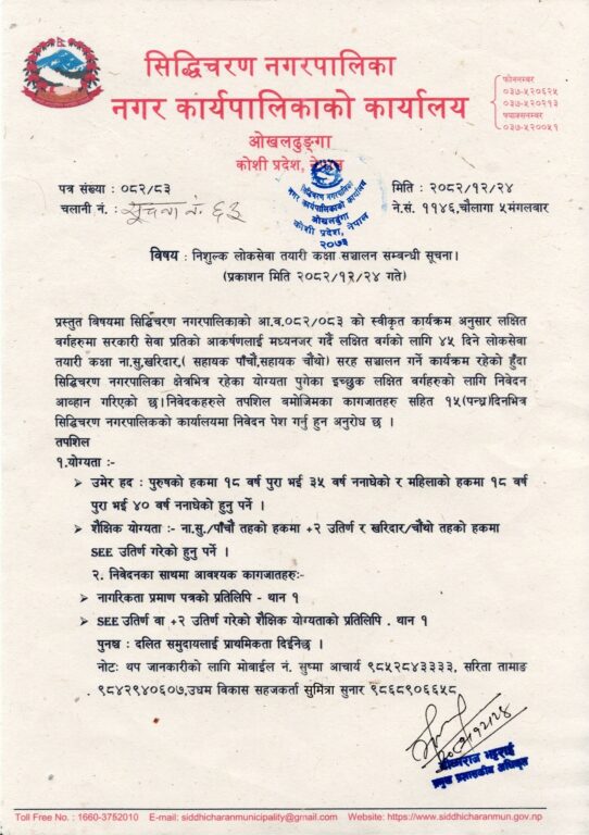 ओखलढुङ्गाको सिद्धिचरण नगरपालिकाले लोकसेवा आयोगको परीक्षा दिन चाहानेहरुका लागि  निःशुल्क तयारी कक्षा सञ्चालन गर्ने भएको छ । नगरपालिकाले नगरपालिका भरिका कक्षा १० र १२ पास गरेका विद्यार्थीहरूलाई नायब सुब्बा र खरिदार पदको लागी लोकसेवा आयोगको तयारी कक्षा सञ्चालन गर्न लागेको हो ।