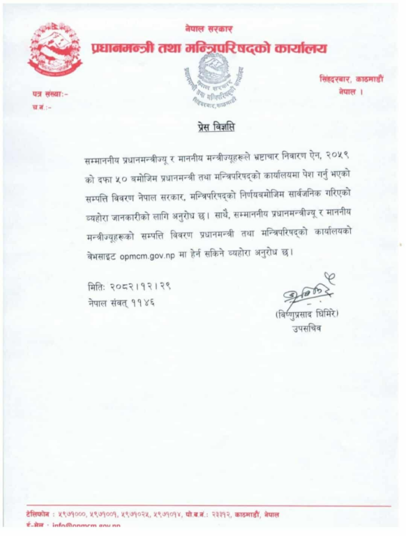 प्रधानमन्त्री तथा मन्त्रीहरूको सम्पत्ति विवरण सार्वजनिक