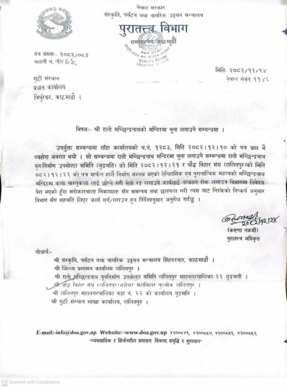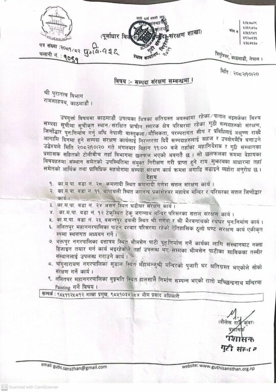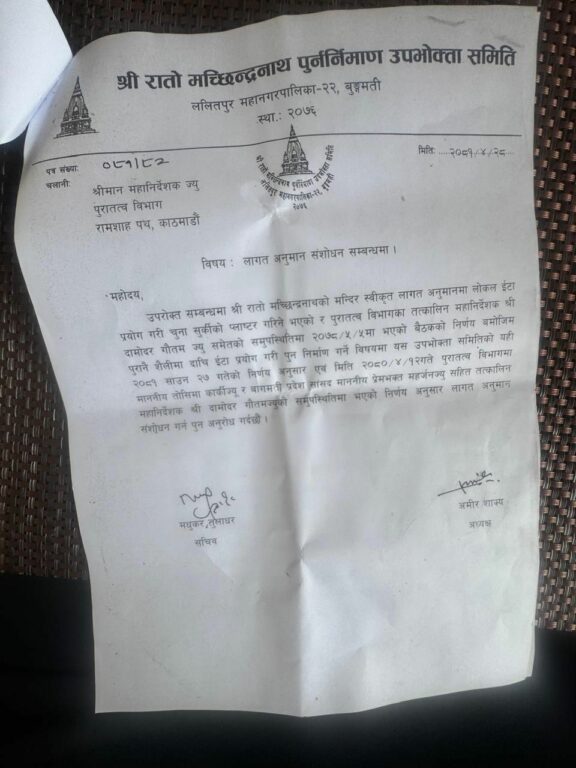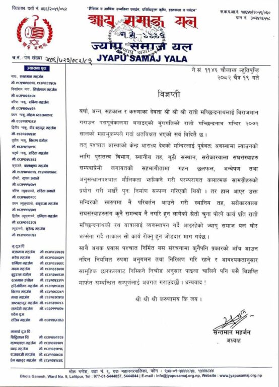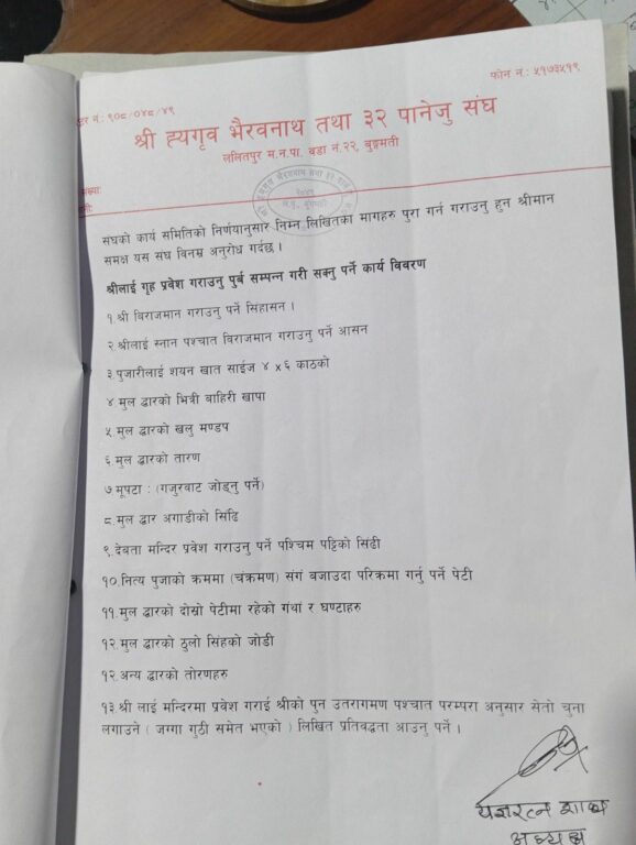 अध्यक्ष सन्तमान महर्जनद्वारा हस्ताक्षरित विज्ञप्तिमा आस्थाको केन्द्र आराध्यदेवको मन्दिरलाई पूर्ववत् अवस्थामा ल्याउन पुरातत्व विभाग स्थानीय तह, गुठी संस्थान र सरोकारवाला संस्था सम्पदा अभियन्तालगायतसँग भएको गहन छलफलपछि मौलिकता झल्किनेगरी परम्परागत र कलात्मक शैलीमा भर्खरै पुनर्निर्माण सम्पन्न भएका मन्दिरलाई स्वरूप परिवर्तन गर्न नहुने उल्लेख छ ।