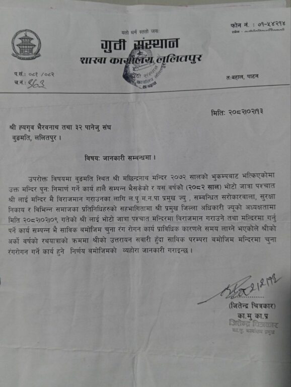 गुठी संस्थान ललितपुुरले दाची अप्पाबाट बनेको मन्दिरमा चुना लगाउने निर्णयसहितको पत्र पठाएपछि बहस सुरु भएको थियो । संस्थानको ललितपुर कार्यालयले २०८२ जेठ १३ गते ललितपुर महानगरपालिकाका मेयर चिरिबाबु महर्जनसहितको सरोकारवालाको बैठकमा भोटोजात्रापछि रथयात्राको क्रममा रातो मच्छेन्द्रनाथको उत्तरायन सवारी हँुदा चुना लगाउने निर्णय गरेको थियो ।