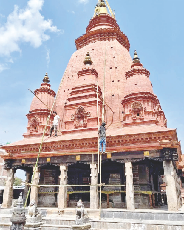 २०७२ सालको भूकम्पले पूर्ण रूपमा ध्वस्त मन्दिर झन्डै एक दशकपछि पुनर्निर्माण गरिएको थियो । शिखरशैलीको यस मन्दिरको बाहिरी स्वरूप कस्तो हुने भन्ने प्रश्नले सरोकारवालामाझ बहस उत्पन्न भएको छ । परम्पराअनुसार मन्दिरमा सेतो चुना पोत्ने कि दाची अप्पा खुला राख्ने भन्ने बहसले सम्पदा संरक्षण र आधुनिक पुनर्निर्माणबीचको सन्तुलनबारे गम्भीर प्रश्न उठाएको छ ।