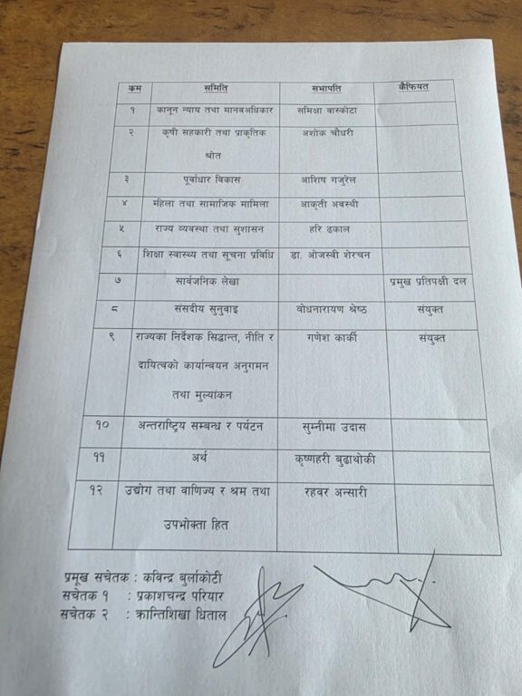 बिहीबार मध्याह्न सिंहदरबारस्थित संसदीय दलको कार्यालयमा बसेको बैठकले प्रतिनिधिसभा अन्तर्गतका विषयगत समितिहरूका लागि उम्मेदवार तय गरेको हो । पार्टीका एक सांसदका अनुसार प्रस्तावित नामहरू बैठकबाट अनुमोदनसमेत गरिएको छ ।