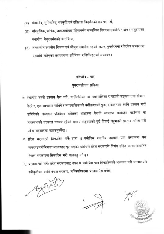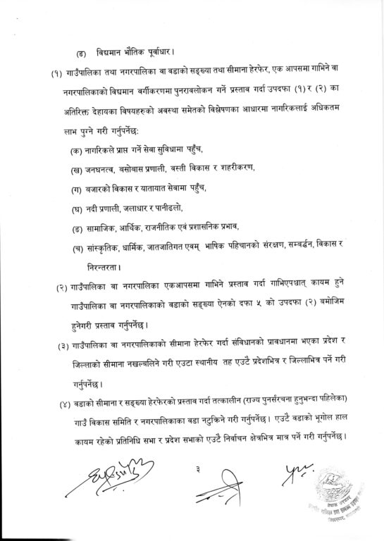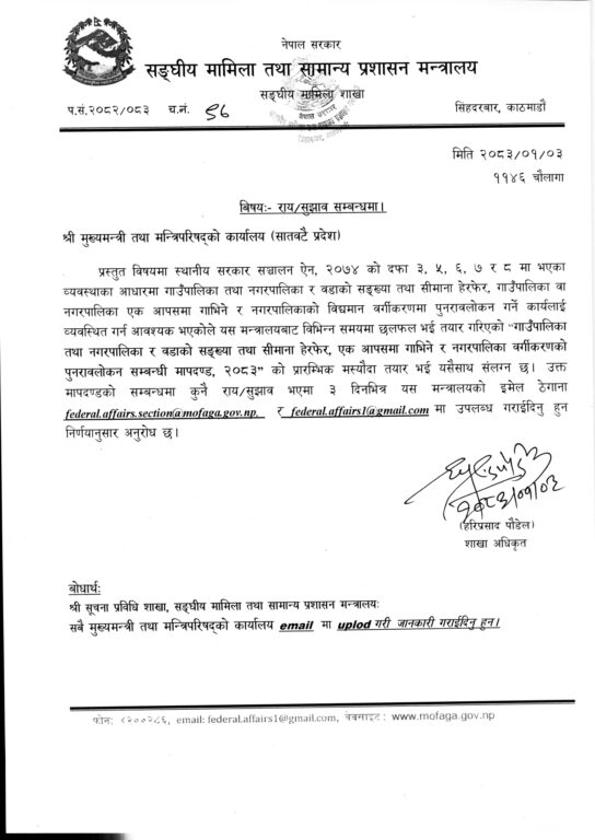 मन्त्रालयले मस्यौदामा सुझाव दिन प्रदेश सरकारहरूलाई तीन दिनको समय दिएको छ। प्रस्तावअनुसार सिमाना हेरफेर गर्दा स्थानीय तह एउटै जिल्ला र प्रदेशभित्र पर्ने व्यवस्था गर्नुपर्नेछ भने वडाहरूलाई पुराना संरचनाअनुसार नटुक्रिने गरी मिलाउनुपर्नेछ।
