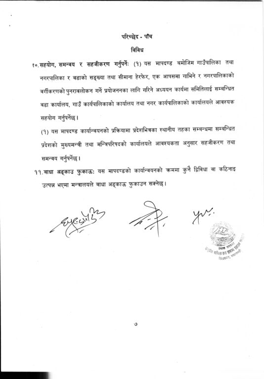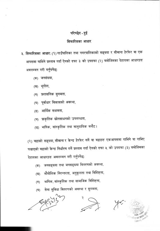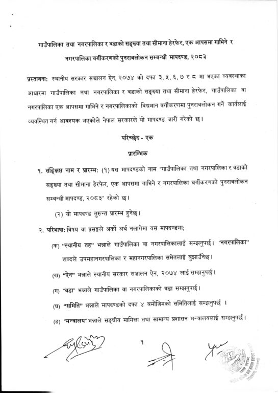 सङ्घीय मामिला तथा सामान्य प्रशासन मन्त्रालयले स्थानीय तहको सङ्ख्या, सिमाना हेरफेर तथा नगरपालिका वर्गीकरण पुनरावलोकनका लागि नयाँ मापदण्डको प्रारम्भिक मस्यौदा तयार गरेको छ। स्थानीय सरकार सञ्चालन ऐन, २०७४ का प्रावधानअनुसार तयार मस्यौदामा जनसङ्ख्या, भूगोल, प्रशासनिक सहजता, पूर्वाधार, आर्थिक क्षमता र सांस्कृतिक पक्षलाई मुख्य आधार मानिएको छ।