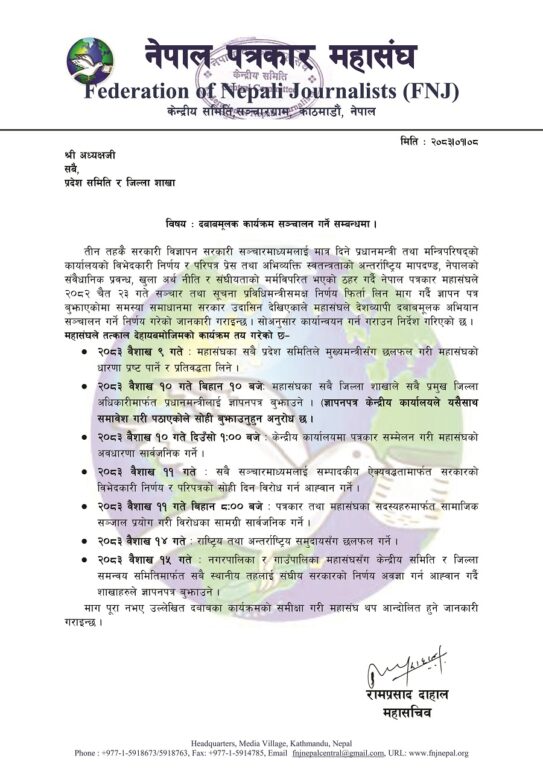 महासंघका महासचिव रामप्रसाद दाहालद्वारा जारी सर्कुलरअनुसार आन्दोलनका कार्यक्रम चरणबद्ध रूपमा सञ्चालन गरिनेछ ।