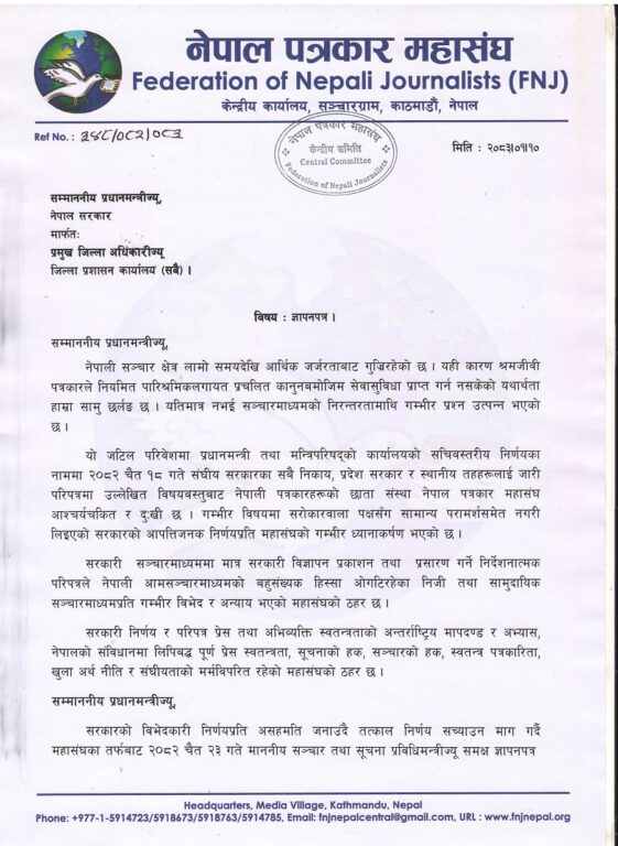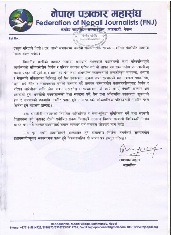 प्रधानमन्त्री तथा मन्त्रिपरिषद्को कार्यालयबाट जारी सचिवस्तरीय परिपत्रमार्फत संघ, प्रदेश र स्थानीय तहका सबै निकायलाई सरकारी विज्ञापन सरकारी सञ्चारमाध्यममै सीमित गर्न निर्देशन दिइएको थियो । यस निर्णयलाई महासंघले “विभेदकारी, असंवैधानिक र प्रेस स्वतन्त्रतामाथिको हस्तक्षेप” भनेको छ ।