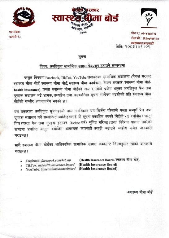 स्वास्थ्य बीमा बोर्डले आफ्नो नाम र लोगो दुरुपयोग गरी सामाजिक सञ्जालमा सञ्चालन भइरहेका अनधिकृत पेज तथा समूहप्रति ध्यानाकर्षण भएको जनाएको छ। बोर्डका अनुसार Facebook, TikTok र YouTube लगायतका प्लेटफर्ममा गलत र भ्रामक सूचना फैलाउने यस्ता पेजहरूले सर्वसाधारणमा भ्रम सिर्जना गरिरहेका छन्।