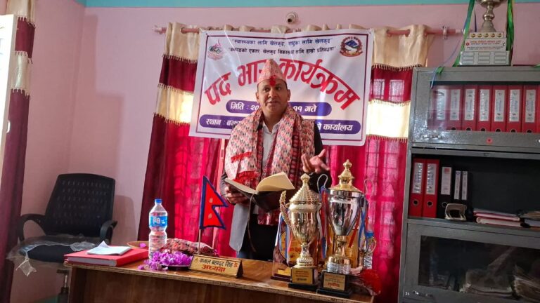 विगत लामो समय देखि रिक्त रहेकाे बझाङ खेलकुद समितिमा बुङ्गल नगरपालिका वडा नं ४ बैसेली झापा घरभएका कमल बहादुर सिंहकाे आज एक औपचारिक कार्यक्रम बिच पदवाहली गरिकाे छ ।