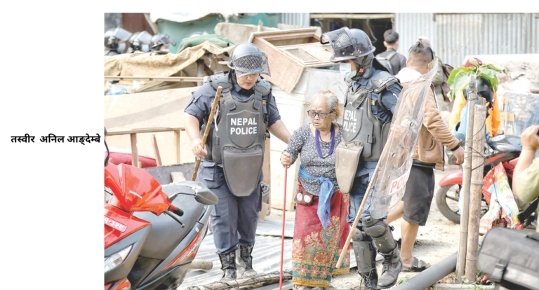 नेपाल प्रहरीले घर खाली गराएपछि कामपा प्रहरीले सफा गरेको थियो भने आश्रय नभएका बच्चा, ज्येष्ठ नागरिक, अपाङ्गता भएकालाई सुरक्षित व्यवस्थापन गरेको थियो । बस्ती खाली गर्नेक्रममा सामान्य झडप भएको थियो । नेपाल प्रहरी र सशस्त्र प्रहरी बलका सुरक्षाकर्मीको बाक्लो उपस्थिति रहेकाले तत्काल स्थिति नियन्त्रणमा आएको थियो । लगत्तै नेपाल प्रहरीले बस्तीमा रहेका घरको सामान सार्न सहयोग गरेको थियो ।