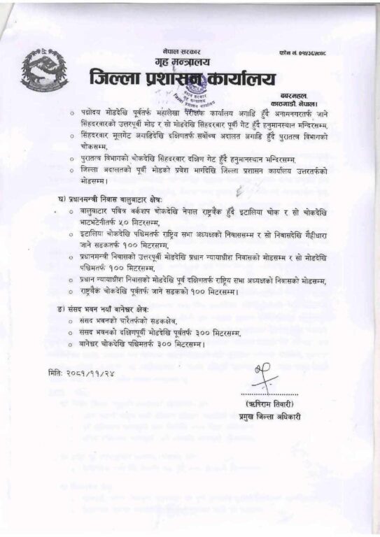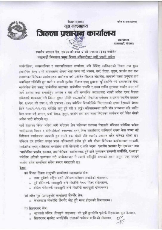 ‘कार्यपालिका, व्यवस्थापिका र न्यायपालिकाका कार्यालय, अति विशिष्ट व्यक्तिहरुको निवास तथा मुख्य प्रशासनिक केन्द्र र सो आसपासका क्षेत्रमा भेला जम्मा भई अनसन, धर्ना, घेराउ, जुलुस, प्रदर्शन तथा सभा लगायतका विरोधका कार्यक्रमहरू आयोजना गर्दा उत्तेजित भीडबाट तोडफोड, आगजनी जस्ता उश्रृंखल तथा अवाञ्छित गतिविधि हुन सक्ने र आपसी मुठभेड, भिडन्त एवम् हुलदङ्गा वा अशान्ति भई अत्यावश्यक सेवा, सार्वजनिक सेवा प्रवाह, सार्वजनिक यातायात, सार्वजनिक सम्पत्ति र समग्र शान्ति सुरक्षामा गम्भीर असर पर्न जानें अवस्था तथा अन्तर्राष्ट्रिय अभ्यास र यस अघि सम्मानित अदालतबाट भएको आदेश एवम् फैसला समेतलाई मध्यनजर गरी जिल्ला सुरक्षा समिति काठमाडौको सिफारिस समेतका आधारमा स्थानीय प्रशासन ऐन, २०२८ को दफा ६ को उपदफा (३क) बमोजिम विगतदेखिकै निरन्तरताको रुपमा देहायको क्षेत्रमा मिति २०८१/११/२५ गतेदेखि लागु हुने गरी २ (दुई) महिनासम्मका लागि पाँच जनाभन्दा बढि व्यक्ति भेला जम्मा भई अनसन, धर्ना, घेराउ, जुलुस, प्रदर्शन तथा सभा जस्ता विरोधका कार्यक्रम गर्न निषेध गरेको आदेश जारी गरिएको छ,’– जिप्रकाबाट जारी भएको आदेशमा भनिएको छ ।