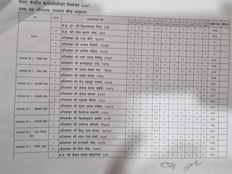 महासचिवमा केदार कोइरालाले ४९३ मत ल्याउँदा यज्ञमणि न्यौपानले २४४ मत मात्रै पाएका छन् भने कोषध्यक्षमा जगतबहादुर कार्कीले ५०९ मत पाउँदा दिपक राईले २२८ मतमा सिमित छन् ।