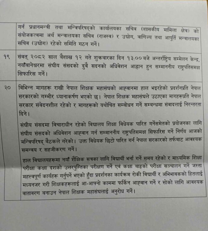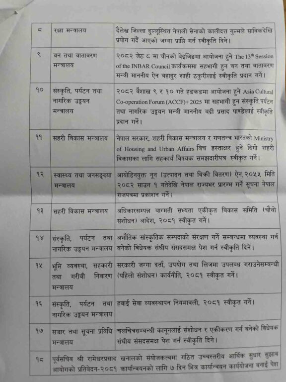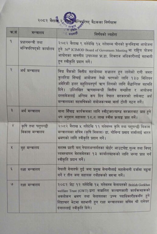 सरकारले मन्त्रिपरिषद् बैठकका निर्णय सार्वजनिक गरेको छ । मङ्गलबार बसेको मन्त्रिपरिषद् बैठकका निर्णय बुधबार सरकारका प्रवक्ता एवम् सञ्चार तथा सूचना प्रविधिमन्त्री पृथ्वीसुब्बा गुरुङले पत्रकार सम्मेलनमार्फत् सार्वजनिक गरेका हुन् ।