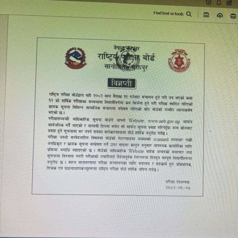 ‘२०८२ साल वैशाख ११ गतेबाट संचालन हुने गरी तय भएको कक्षा १२ को वार्षिक परीक्षाका सम्बन्धमा विद्यार्थी वर्गमा भ्रम सिर्जना हुने गरी परीक्षा स्थगित गरिएको भ्रामक सूचना विभिन्न सामाजिक संजालमा सम्प्रेषण गरिएकोप्रति बोर्डको गम्भीर ध्यानाकर्षण भएको छ, बोर्डको आधिकारिक वेबसाइटबाहेक अन्यत्रको समाचार तथा सूचनामा विश्वास नगरी परीक्षाको तयारीलाई धैर्यतापूर्वक निरन्तरता दिन हुन सम्पूर्ण विद्यार्थीहरूमा अनुरोध छ, सहज वातावरणमा परीक्षा सञ्चालनका लागि समन्वय र सहकार्य हुन अभिभावक, शिक्षक एवं प्रधानाध्यापकज्यूहरूमा राष्ट्रिय परीक्षा बोर्ड हार्दिक अपिल गर्दछ,’ जारी विज्ञप्तिमा उल्लेख छ।