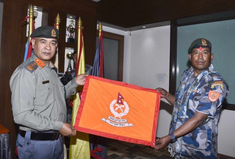 प्रधानमन्त्री  ओलीद्वारा सगरमाथा आरोहणमा जान लागेका सशस्त्र प्रहरी सहायक निरीक्षक छत्याललाई  झन्डा हस्तान्तरण