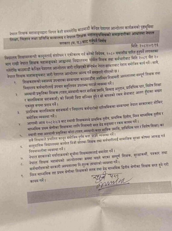 . चैत २० देखि शुरू भएको प्रदर्शन २५ गतेबाट आम शैक्षिक हड्तालमा परिणत भएको थियो । मंगलवार सकरात्मक भएको वार्ता हिजो बुधबार सहमतिमा पुगेको हो । मंगलवार तीनजना मन्त्रीले महासंघले उठाएका मागको बारेमा मन्त्रिपरिषद्को बैठकले निर्णय गर्ने आश्वासन दिएअनुरूप बुधबार सहमति भएको हो ।