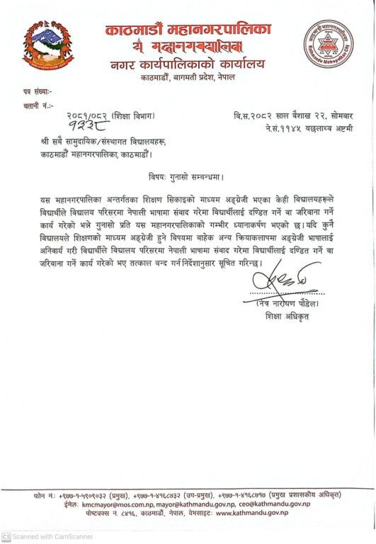 ‘यस महानगरपालिका अन्तर्गतका शिक्षण सिकाइको माध्यम अङ्ग्रेजी भएका केही विद्यालयहरूले विद्यार्थीले विद्यालय परिसरमा नेपाली भाषामा संवाद गरेमा विद्यार्थीलाई दण्डित गर्ने वा जरिवाना गर्ने कार्य गरेको भन्ने गुनासो प्रति यस महानगरपालिकाको गम्भीर ध्यानाकर्षण भएको ’, पत्रमा भनिएको छ, ‘यदि कुनै विद्यालयले शिक्षणको माध्यम अङ्ग्रेजी हुने विषयमा बाहेक अन्य क्रियाकलापमा अङ्ग्रेजी भाषालाई अनिवार्य गरी विद्यार्थीले विद्यालय परिसरमा नेपाली भाषामा संवाद गरेमा विद्यार्थीलाई दण्डित गर्ने वा जरिवाना गर्ने कार्य गरेको भए तत्काल बन्द गर्न निर्देशानुसार सूचित गरिन्छ।’
