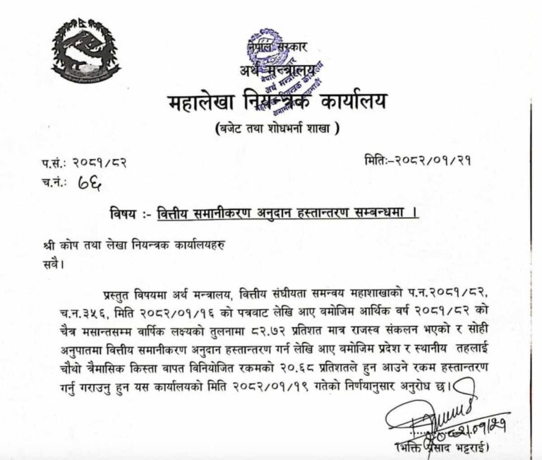 राजस्व संकलनमा कमी र खर्चमा असन्तुलन देखिएपछि सरकारले प्रदेश तथा स्थानीय तहलाई दिने समानीकरण अनुदानको चौथो किस्ता कटौती गरेको छ । अर्थ मन्त्रालयका अनुसार विनियोजित रकमको केवल २० प्रतिशत मात्र हस्तान्तरण हुने भएको हो ।