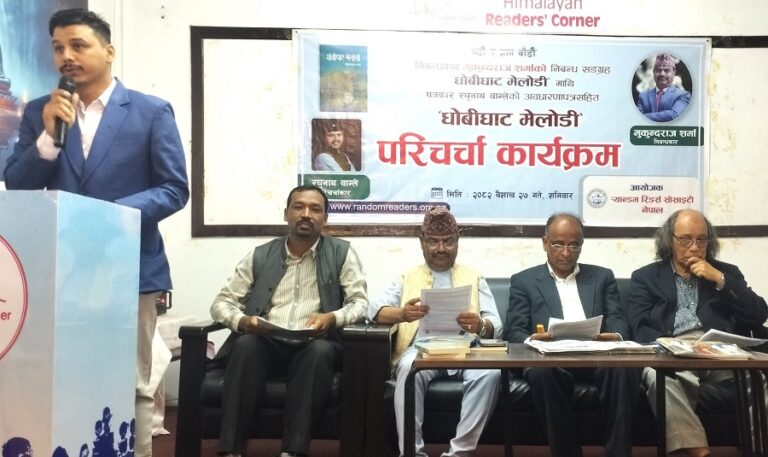 निबन्धकार मुकुन्दराज शर्माको निबन्ध सङ्ग्रह ‘धोबीघाट मेलोडी’ माथि परिचर्चा कार्यक्रम शनिबार रिडर्स कर्नर पोखरामा भएको छ । कामना न्यूज पब्लिकेसन्स्द्वारा प्रकाशित पुस्तकमाथि भएको परिचर्चा कार्यक्रममा साहित्यकार शर्माले आफूलाई प्रश्न आएपछि मात्रै सफल भएको महसुस गरेको सुनाए ।