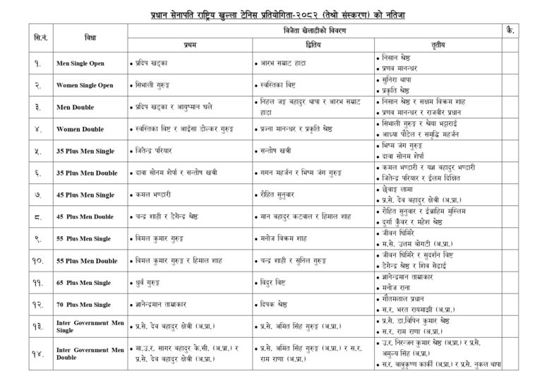 वैशाख २१ गतेबाट सुरु भएको प्रतियोगिता जङ्गी अड्डा र दशरथ रङ्गशालास्थित टेनिस कोर्टमा सञ्चालन भएको थियो ।