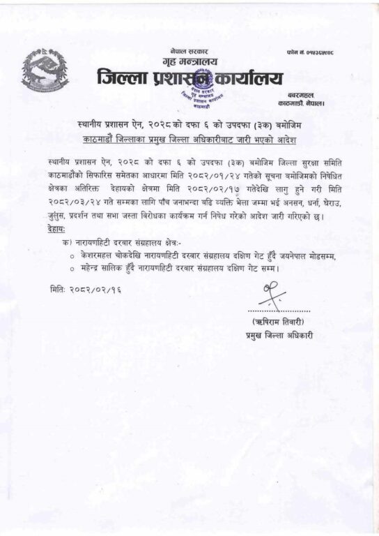 केशरमहल चोकदेखि नारायणहिटी दरवार संग्रहालय दक्षिण गेट हुँदै जयनेपाल मोडसम्म तथा महेन्द्र सालिक हुँदै नारायणहिटी दरबार संग्रहालय दक्षिण गेटसम्म विरोधका कार्यक्रम गर्न नपाइने विज्ञप्तिमा उल्लेख छ।